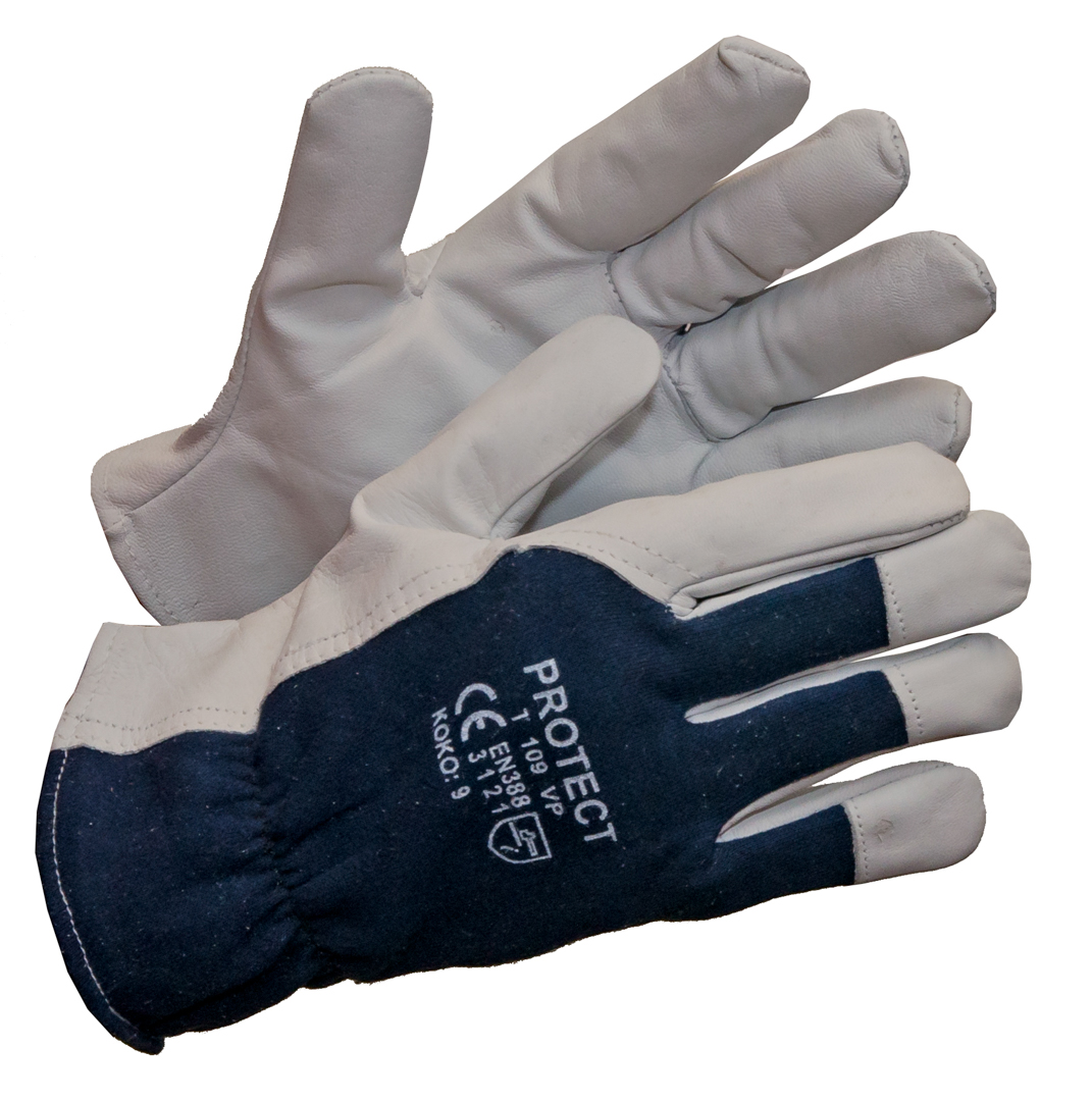 Asentajan työsormikas, kestävä vuohenpintanahkakämmen, joustava puuvillakangasselkä, vuoriton. Kämmen, sormenpäät, etusormi ja peukalo nahkaa. Koot 7-11. 12 paria nipussa, 240 paria laatikossa.