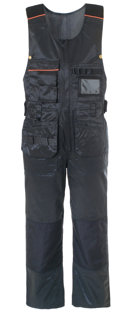 Avohaalari riipputaskuilla työ ja vapaa-ajan käyttöön. Väri: musta. Sivusta aukeavat ja tarralla suljettavat polvisuojataskut kulutusta kestävää Corduraa. 13 kpl taskuja: riipputaskut edessä ja takana, kännykkätasku, tarralla suljettava henkilökorttitasku, 2 avointa suurta etutaskua, 2 suurta takataskua, 2 rintataskua ja mittatasku. Lisäksi työkalutaskuja. Tuplaommellut saumat. Kaksisuuntainen vetoketju etuosassa. Joustava vyötärökiristys vyölenkkeineen. Heijastintereet lahkeissa tuovat avohaalariin näyttävyyttä ja parantavat näkyvyyttä pimeällä. Vasaralenkit. D-lenkki ja kynätasku. Joustava ja hengittävä selkämateriaali. Materiaali: Tuulenpitävä, likaa hylkivä ja kulutusta kestävä mittamuutos- ja repäisylujuustestattu kangas. 45% puuvilla / 55% polyesteri, 270 g/m2. Koot: 46-64.