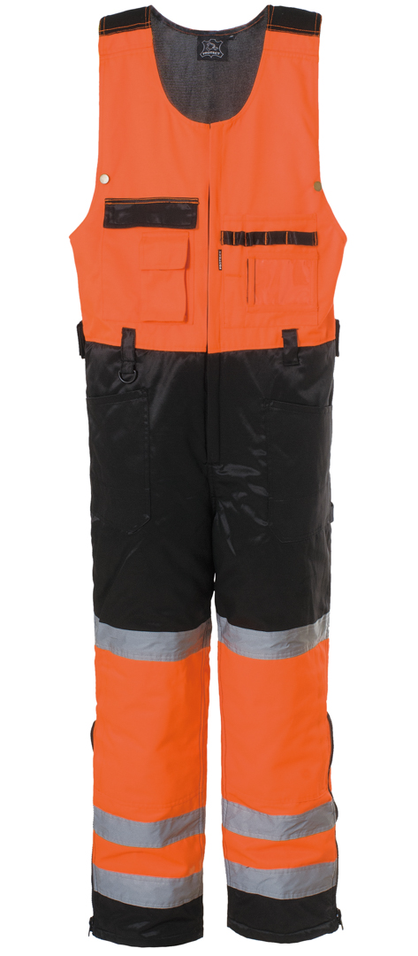 EN 20471 luokitellut (luokka 2) huomioavohaalarit tikkivuorella. Väri: huomio-oranssi/musta. 9 kpl taskuja: kännykkätasku, tarralla suljettava henkilökorttitasku, 2 avointa suurta etutaskua, 2 suurta läpällistä takataskua, 2 rintataskua ja mittatasku. Lisäksi työkalutaskuja. Tuplaommellut saumat. Kaksisuuntainen vetoketju etuosassa. Sivusta aukeavat ja tarralla suljettavat polvisuojataskut. Joustava vyötärökiristys vyölenkkeineen ja lahkeissa pukemista helpottavat sivuvetoketjut. Vasaralenkit. D-lenkki ja kynätasku. Joustava ja hengittävä selkämateriaali.EN 20471 lk 1. Materiaali: Tuulenpitävä, likaa hylkivä ja kulutusta kestävä mittamuutos- ja repäisylujuustestattu kangas.Päällikangas: huomioväri 20% puuvilla / 80% polyesteri, musta 45% puuvilla / 55% polyesteri, 270 g/m2. Vuori: 100% nylon, 80 g/m2. Vanu: 100% polyesteri, 100/120 g/m2. Koot: 46-64.