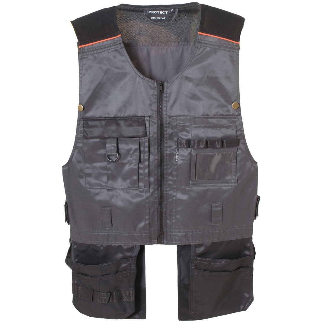 Riipputaskuliivi, musta/harmaa, joustava ja hengittävä hartiaosa, runsaasti erilaisia taskuja mm. piilotettava henkilökorttitasku ja kännykkätasku, riipputaskut edessä ja takana, rintataskut, kynätaskut, vasaralenkit jne., tuplavetoketju, säädettävissä kahteen leveyteen.Jäljellä kokoja: 54, 56, 62
