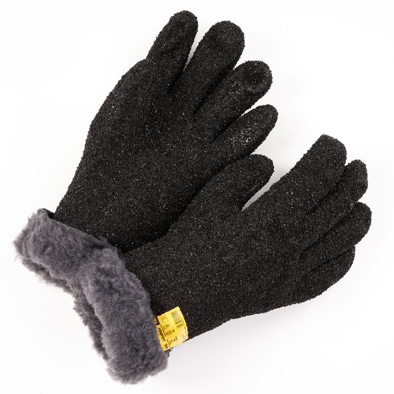 Kotimainen musta öljynkestävä rouhesormikas irrotettavalla teddyvuorella. Koot: 10-12. 10 paria laatikossa.