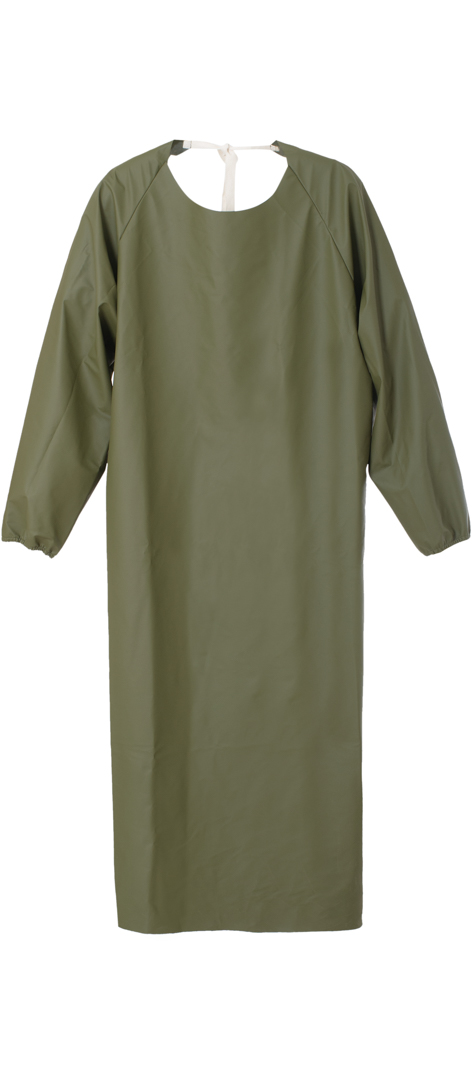 PU-esiliina hihoilla, rasvaa ja likaa hylkivää joustavaa PU-kangasta, kiinnitys takaa kangas- nauhoilla. Koko: XL. 10 kpl laatikossa.