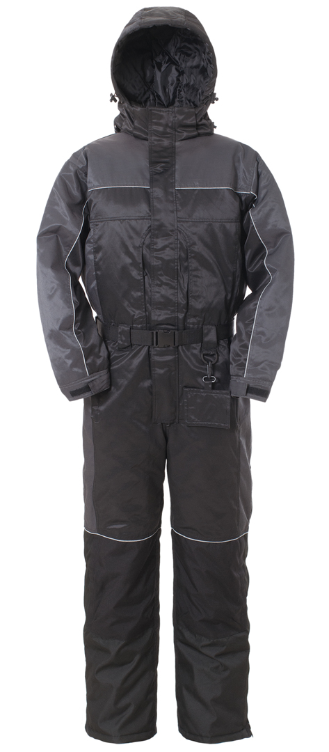 Talvihaalari tikkivuorella työ- ja vapaa-ajan käyttöön. Väri: musta/grafiitinharmaa. Irroitettava ja säädettävä huppu. Sivusta aukeavat ja tarralla suljettavat polvisuojataskut kulutusta kestävää Cordura-materiaalia. Runsaasti erilaisia taskuja: 2 vetoketjulla suljettavaa rintataskua, 2 vetoketjulla suljettavaa sivutaskua ja 2 povitaskua, joista toinen vetoketjulla ja toinen tarralla. Lisäksi irroitettava henkilökorttitasku. Heijastintereet edessä ja takana tuovat haalariin näyttävyyttä ja parantavat näkyvyyttä pimeällä. Kauluksen ylösasti ulottuva vetoketju, hihansuiden lämpimät piiloresorit ja suojalista edessä olevan 2-suuntaisen vetoketjun päällä pitävät kylmän loitolla. Lisämukavuutta tuo kauluksen lämmin ja pehmeä fleecevuoraus, tarralla säädettävät hihansuut ja mukana tuleva vyö. Lahkeissa edessä ja takana kosteudelta suojaavaa materiaalia. Joustava vyötärönkiristys ja lahkeissa pukemista helpottavat 2-suuntaiset sivuvetoketjut vyötärölle asti, jotka mahdollistavat myös pääsyn alla olevien housujen taskuille. Lahkeissa lumilukot ja vyötäröllä D-lenkki. Tuplaommellut saumat. Materiaali: Tuulenpitävä, likaa hylkivä ja kulutusta kestävä mittamuutos- ja repäisylujuustestattu kangas. Päällikangas: 45% puuvilla / 55% polyesteri, 270 g/m2. Vuori: 100% nylon, 80 g/m2. Vanu: 100% polyesteri, 100/120 g/m2. Koot: 46-64.