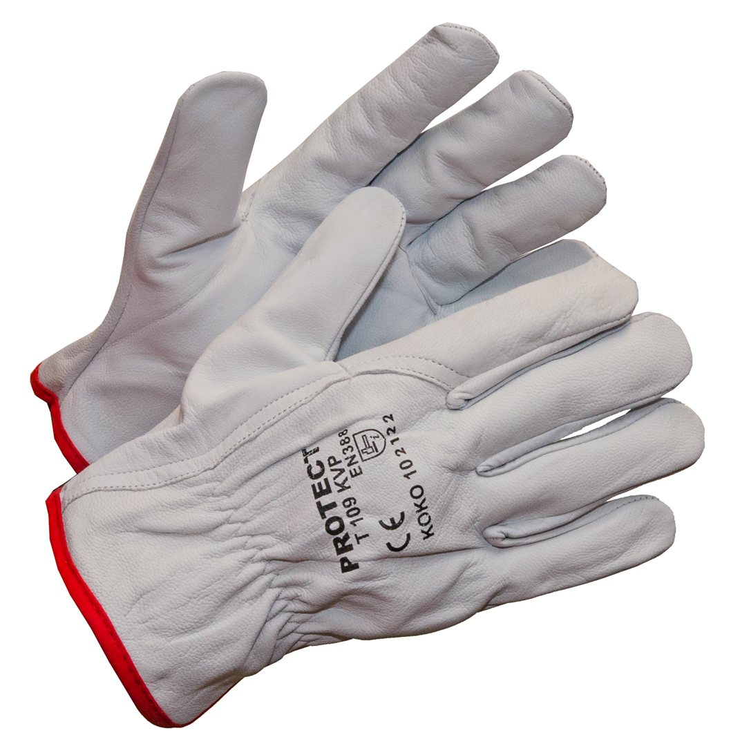 Asentajan työsormikas, kestävä vuohennahkakämmen ja selkäosa. Koot 7-12. 12 paria nipussa, 120 paria laatikossa.