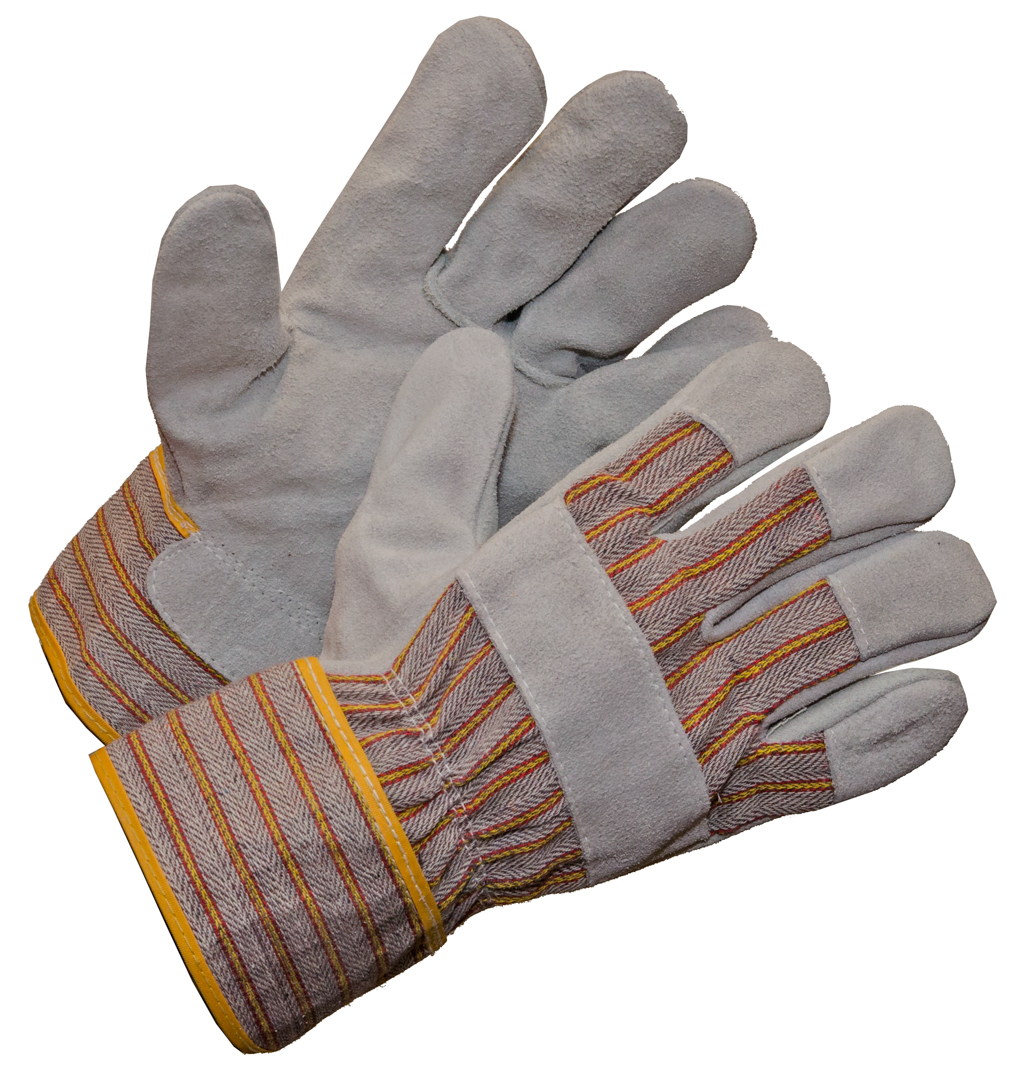 Työsormikas, nautahaljaskämmen, puuvillakangasselkä, vuoriton. Koko: 10,5. 12 paria nipussa, 120 paria laatikossa.